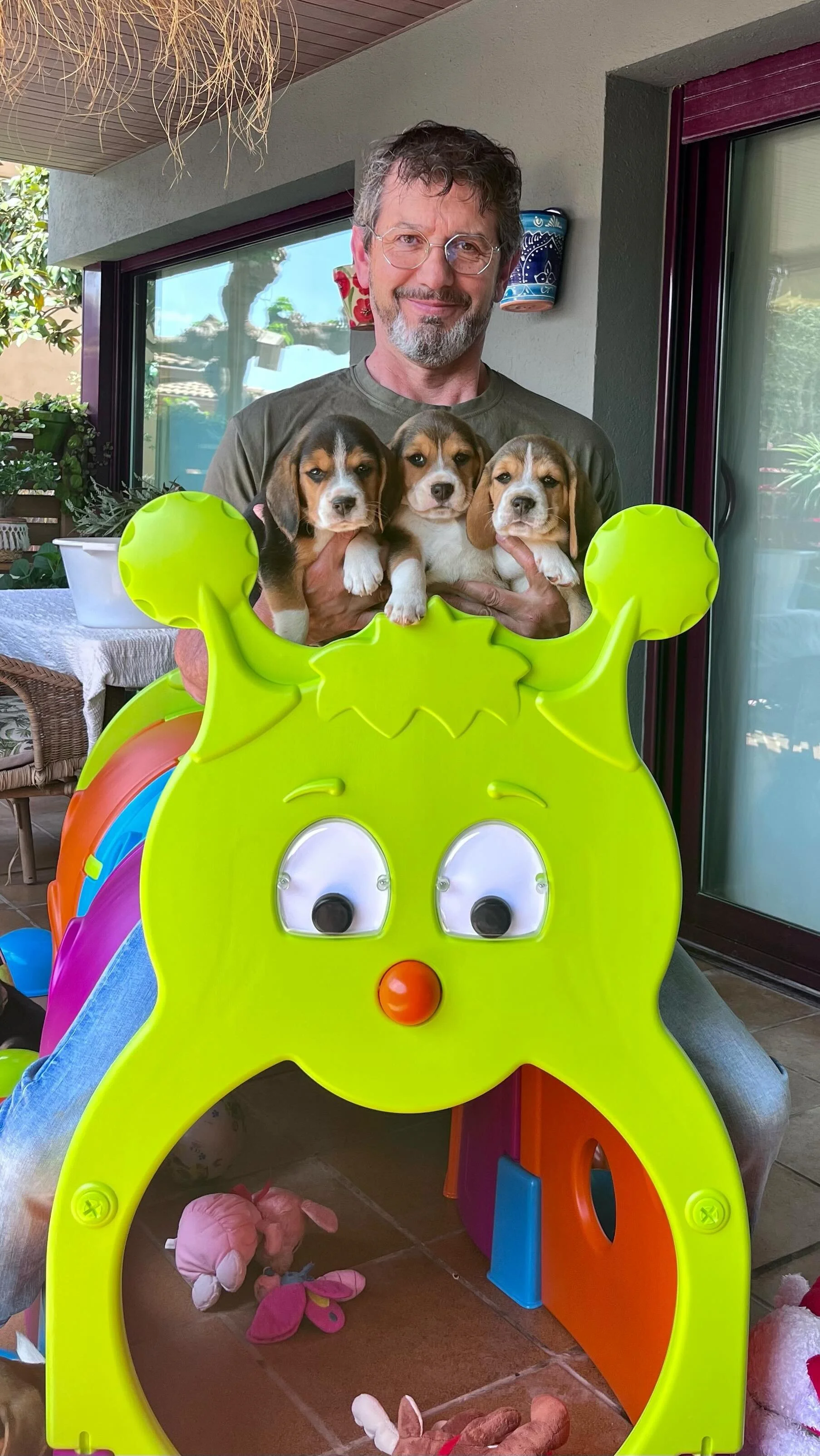 Me enamoré de ésta raza el año 1998, desde entonces y hasta día de hoy, o sea, hace 25 años, nunca me he separado de ellos. He disfrutado de los beagles tanto como perros de trabajo como animales de compañía. A lo largo de los años he visto que mucha gente los cataloga como cazadores, pero creo que ésta descripción no se ajusta a la realidad, ya que como perros de trabajo pueden ser brillantes en la recolección de la trufa, en los aeropuertos donde ayudan a las policías de muchos países a localizar substancias o productos prohibidos en los equipajes, ayudar a las personas con dificultades psicológicas o físicas , en la caza , etc. Siempre explico que no nacen enseñados, por tanto, si queremos un ejemplar para trabajo, sea el que sea, habrá que adiestrarlo. El nuestro es un proyecto sin fin, siempre nos esforzamos en escoger los mejores ejemplares para ir mejorando nuestra línea. Nuestro afijo Beagles de Puigventós es, después de tantos años, muy conocido.